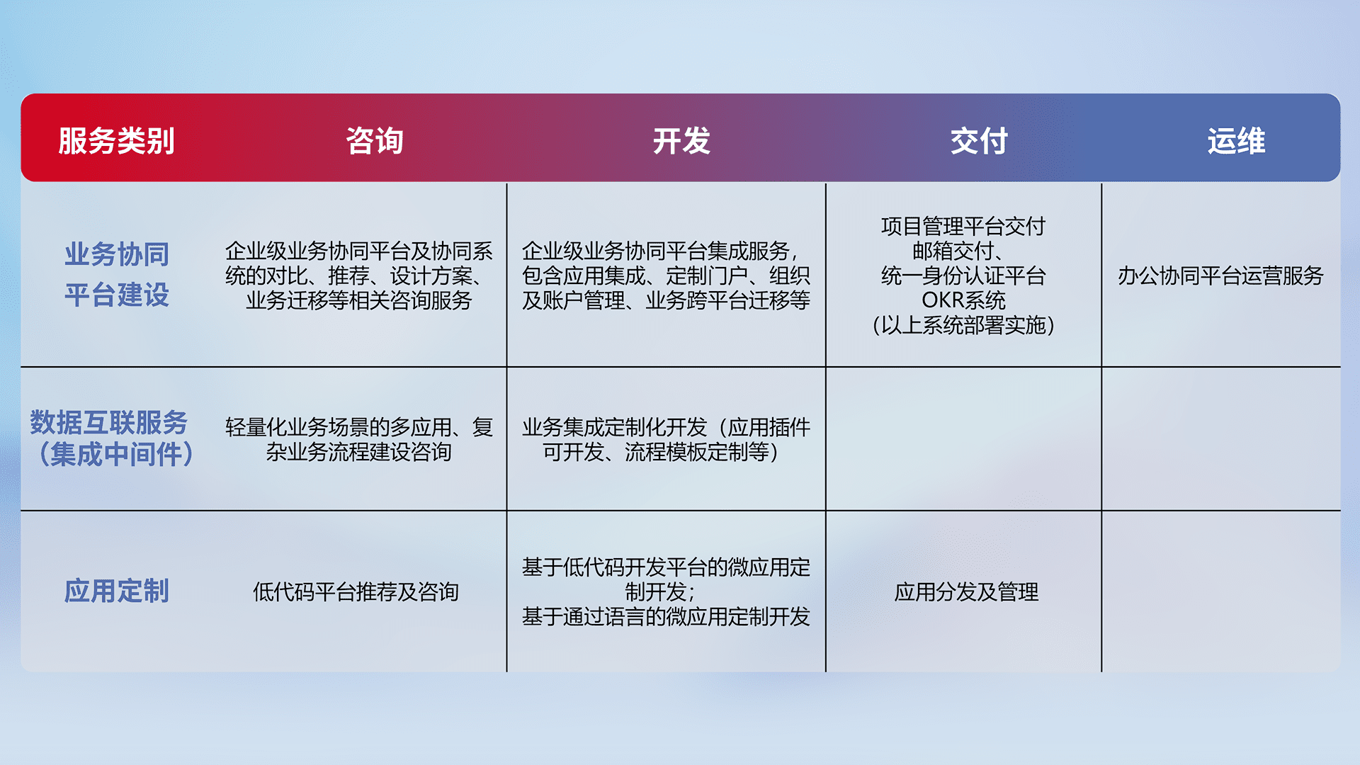 针对钉钉、、、、企微、、、、IDaas等平台级产品提供产品的规划、、、方案、、交付、、、、定制化开发等服务,,,,实现如统一协同办公、、、智能客户服务、、、混合会议管理、、智能数据查询、、、、等业务场景,,,实现数字化转型。。。。